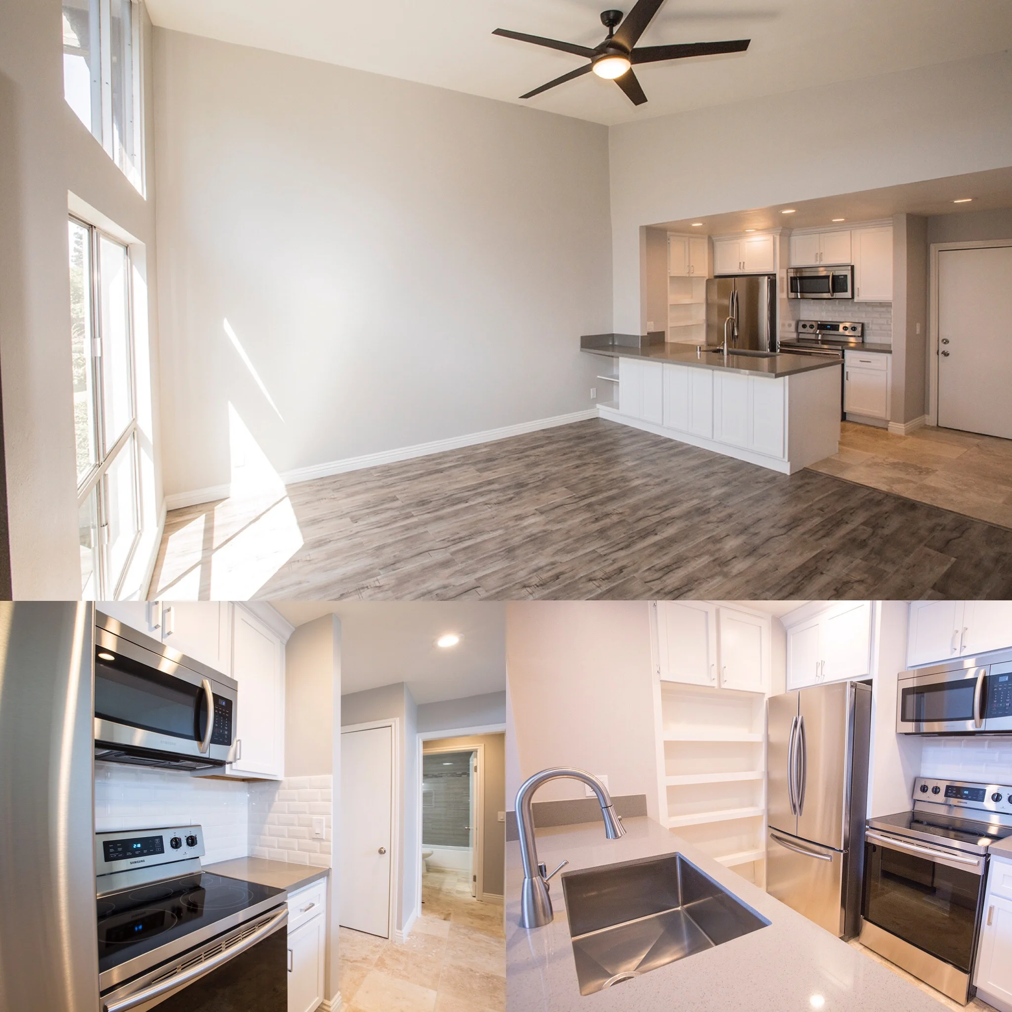 Remarkable is the best word to describe the level of craftsmanship on display in this newly remodeled corner unit. Inside you’ll find a versatile open floor plan with soaring ceilings, wood laminate floors, crown molding, LED recessed lighting and high-end remote controlled Fanimation fans in the living area and bedroom. The travertine floors, custom cabinetry, and caesarstone countertops in the entertainer’s kitchen are complimented by a full suite of new matching stainless steel appliances by Samsung, including a French door refrigerator, whisper-quiet dishwasher, plus an ultra-modern range and microwave. The cathedral ceilings extend to the master bedroom, which opens to a deck that delivers additional light and air to the room. The bathroom has been covered in fine tile with travertine floors and brushed nickel finishes. This unit has but one shared wall and no neighbors living above or below. Covered assigned parking with a storage unit is included and along with the pool & hot tub are just steps to your front door. Perfect location in a gated community near shopping, with easy access to the 110 freeway. A must see property at an incredible price.